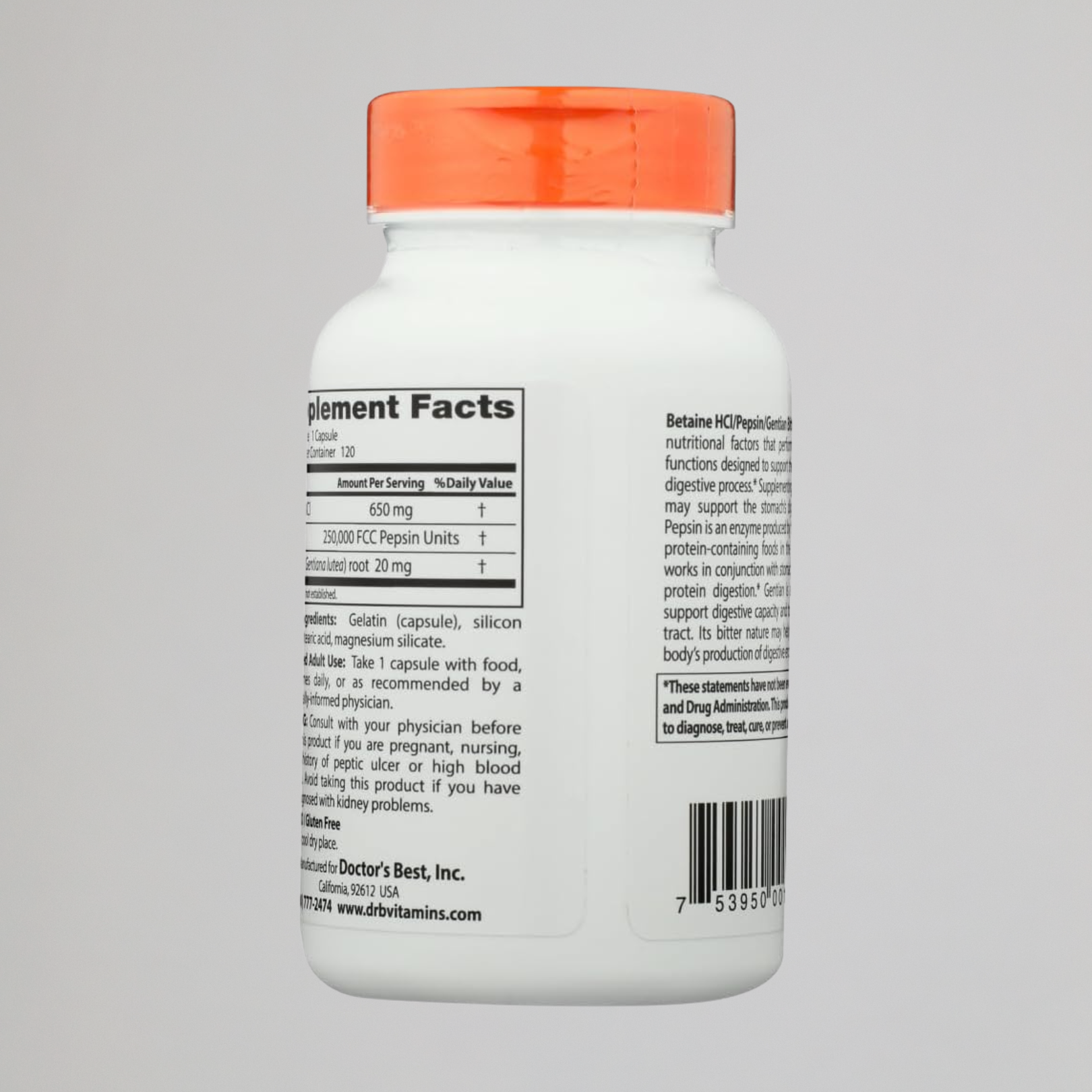 Betaine hci/pepsin/gentian bitters contains three nutritional factors that perform complementary functions designed to support the efficiency of the digestive process. supplementing with betaine hci may support the stomach's digestive capacity.* pepsin is an enzyme produced by the body to digest protein-containing foods in the stomach. pepsin works in conjunction with stomach acid to support protein digestion.* gentian is an herb used to optimize the digestive capacity and tonify the digestive tract. its bitter nature may help to stimulate the body's production of digestive enzymes.*for optimal digestive support, use this supplement in conjunction with best digestive enzymes - all vegetarian, a uniquely formulated, full-spectrum high potency digestive enzyme blend.
