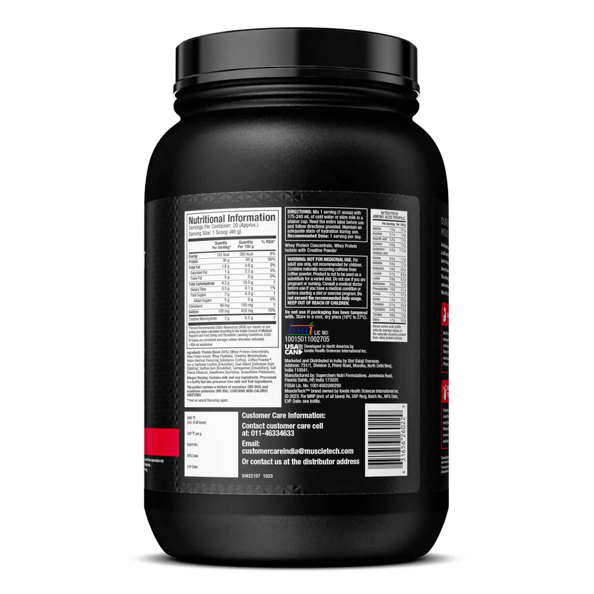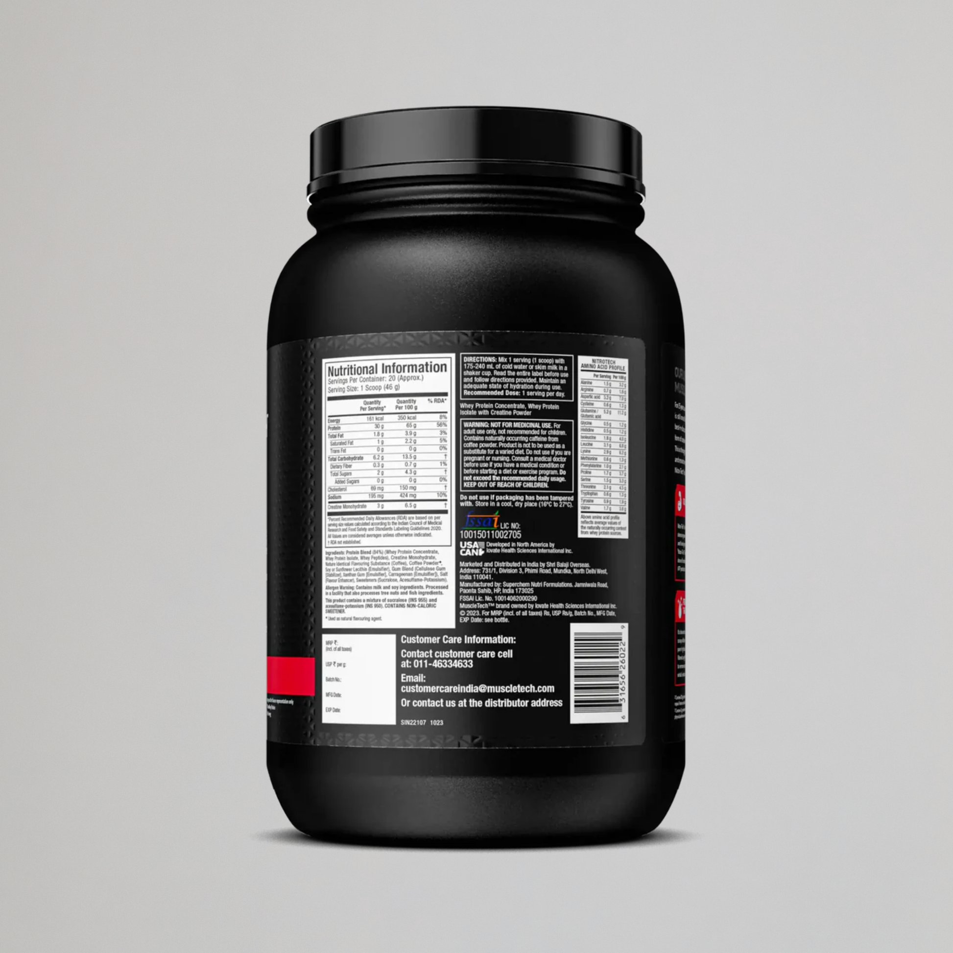 Protein Blend (86%) (Whey, Protein Concentrate, Whey Protein Isolate, Whey Peptides), Creatine Monohydrate, Cocoa (Processed with Alkali), Natural and Artificial Flavours (Chocolate, Vanilla), Soy and Sunflower Lecithin (Emulsifier), Gum Blend (Cellulose Gum [Stabilizer]. Xanthan Gum [Emulsifier], Carrageenan [Emulsifier]), Sweetener (Sucralose, Acesulfame-Potassium), Salt (Flavour Enhancer).